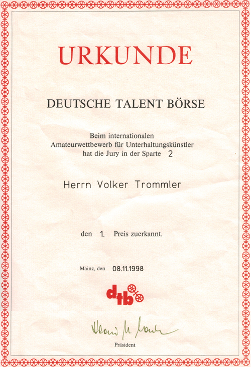 die im Mainzer Schloss ausgetragen wurde teil. In der Kategorie Beste Stimme international belegte ich den 2. Platz. Nach meiner Zeit bei Robinson bewarb ich abermals bei der deutschen Talentbörse und wurde zum Finale zugelassen. Mit einem Sieg und der goldenen Erfolgsleiter brachten wir die Trophäe nach Hause. Darauffolgend hatte ich einige Einsätze bei verschiedenen Veranstaltungen in Deutschland und Österreich. Kontakte die geknüpft wurden halten bis heute an.